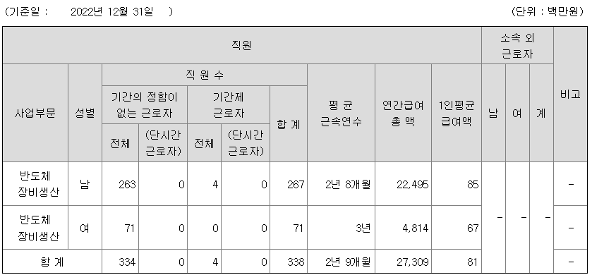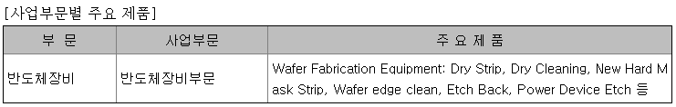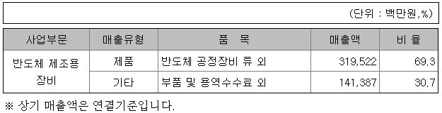 당사는 현재 반도체장비(전공정 장비) 사업을 영위하고 있으며, 단일 사업부문으로 그 현황을 기재하였습니다. 또한 종속회사의 주요사업이 반도체 장비 (전공정 장비)의 제조 및 이와 관련한 부품 및 원자재 제조, 판매, 기술서비스 법인으로 구성되어 있어 따로 구분하지 아니하였습니다.