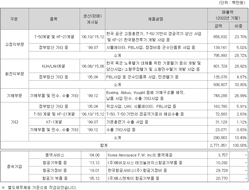 당사와 종속회사는 항공기, 우주선, 위성체, 발사체 및 동 부품에 대한 설계, 제조, 판매, 정비 등의 사업을 영위하고 있습니다. 군수사업의 대부분은 내수로 구성되며 수요자인 한국정부(방위사업청)와 계약을 통해 제품(군용기)의 연구개발, 생산, 성능개량, 후속지원 등을 수행하고 있습니다.
