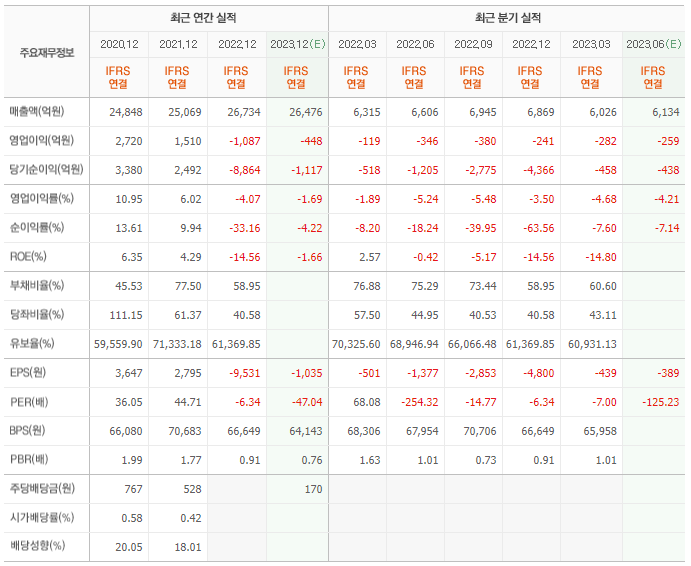 2022년 실적은 2조 6734억, 영업이익은 -1087억입니다. 그리고 영업이익률은 -4.07%입니다.