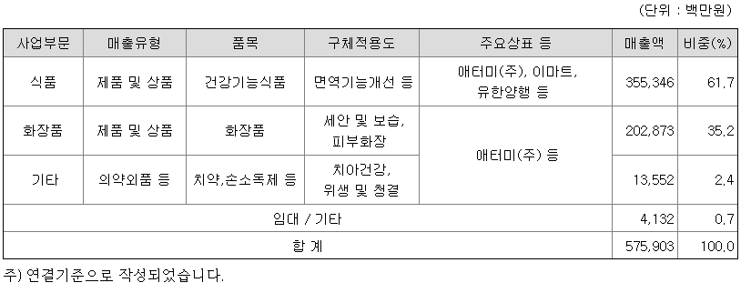당사와 종속회사인 ㈜에치엔지와 강소콜마에서 면역기능개선, 장건강개선, 혈당개선 등의 다양한 건강기능식품과 화장품의 ODM/OEM 사업을 진행 중입니다. 또한 종속법인 근오농림㈜에서 당귀, 천궁, 작약 등의 원재료 재배를 담당하고 있습니다.