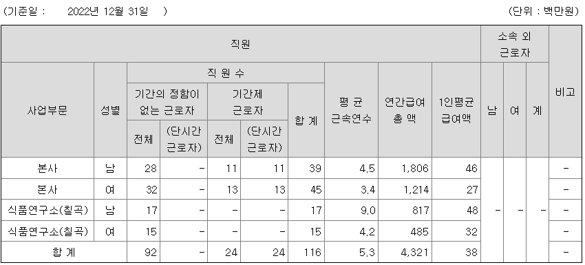 | 사업부문 | 성별 | 직원수 | 평균근속연수 | 평균연봉(백만) |