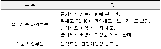 당사는 2019년 5월 2일부터 주요 업종을 기초 의약물질 및 생물학적제제 제조업으로 변경하였습니다. 한편, 당사는 당기 중 위생사업부문과 식품사업부문 내 발효사업부의 사업을 중단하고 관련사업 일체를 양도하였으며 보고서 기준일 현재 줄기세포사업과 식품사업을 영위하고 있습니다.