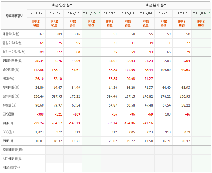 2022년 매출은 216억, 영업이익은 -95억, 당기순이익은 -68억입니다. 그리고 영업이익률은 -44.09%입니다.