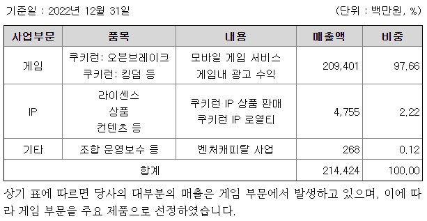 당사는 스마트폰 출시 초창기부터 모바일게임 개발에 집중하였고, '쿠키런'이라는 당사의 독자적인 IP를 활용한 다양한 작품들을 개발, 운영해오고 있습니다. 대표작으로는 '쿠키런 for kakao', '쿠키런: 오븐브레이크', '쿠키런: 킹덤' 등입니다. 현재, 다양한 게임들을 서비스 중에 있으며 추가적으로 여러 플랫폼을 활용한 신작 게임들을 개발 중입니다. 또한 세계적인 인지도를 가진 '쿠키런' IP 관련 산업, 벤처캐피탈을 통한 Capital Gain 등 사업의 다각화를 추진하고 있습니다.
