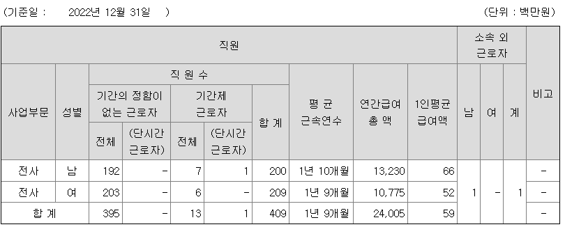 | 사업부문 | 성별 | 직원수 | 평균근속연수 | 평균연봉(백만) |