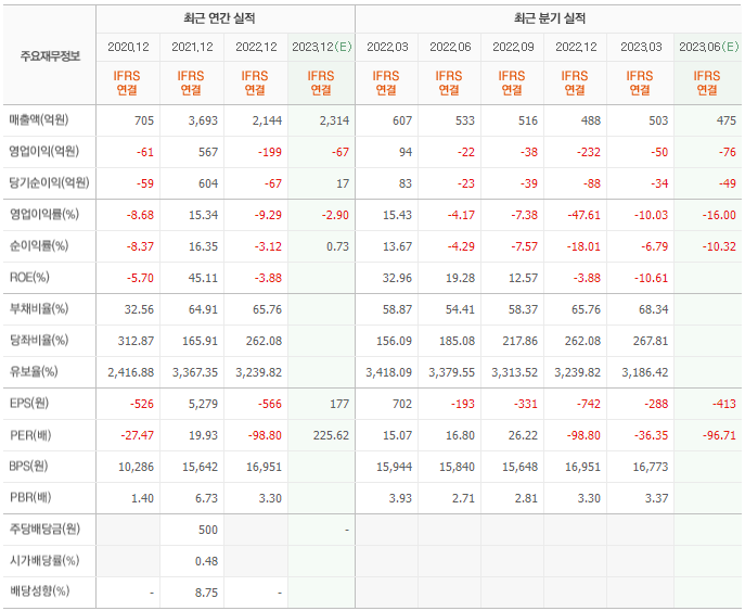 2022년 매출은 2144억, 영업이익은 -199억, 당기순이익은 -67억입니다. 그리고 영업이익률은 -9.29%입니다.