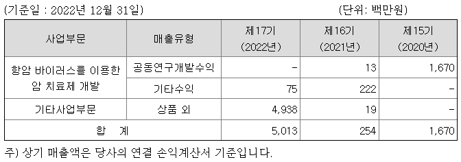 당사는 본 보고서 작성기준일 현재 항암신약을 개발 중인 회사이며, 상품의 판매에 의한 매출이 별도로 존재합니다. 당사의 매출 유형은 공동연구개발 수익, 라이선스 수익 등으로 구성되어 있으며 유형별 매출은 다음과 같습니다.
