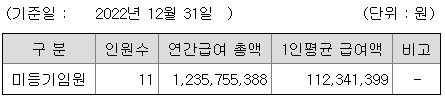미등기임원의 평균연봉은 1억 1200만원이고 직원수는 11명입니다.