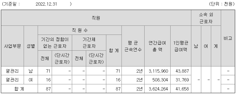 | 사업부문 | 성별 | 직원수 | 평균근속연수 | 평균연봉(백만) |