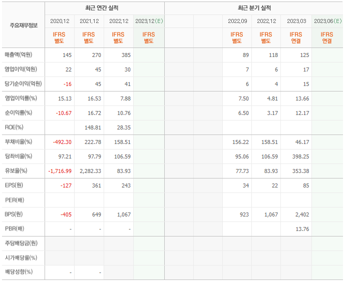 2022년 매출은 385억, 영업이익은 30억, 당기순이익은 41억입니다. 그리고 영업이익률은 7.88%입니다.