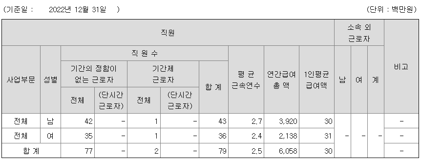 | 사업부문 | 성별 | 직원수 | 평균근속연수 | 평균연봉(백만) |