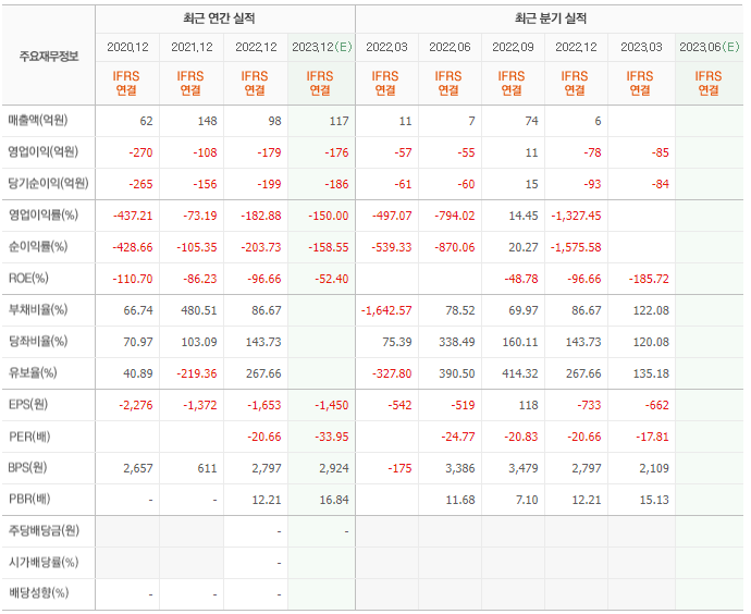 2022년 매출은 98억, 영업이익은 -179억, 당기순이익은 -199억입니다. 그리고 영업이익률은 -182.88%입니다.