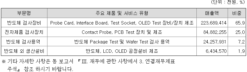 회사와 그 종속기업(이하'연결 회사')는 반도체와 디스플레이의 테스트 외 관련 제품을 공급하는 전문기업으로서 당사 제품의 특성에 따라 "반도체 검사장비", "전자제품 검사장치", "반도체 검사용역", "반도체 외 생산설비"로 나누어 독립 경영을 하고 제조 및 판매하는 사업 등을 영위하고 있습니다.