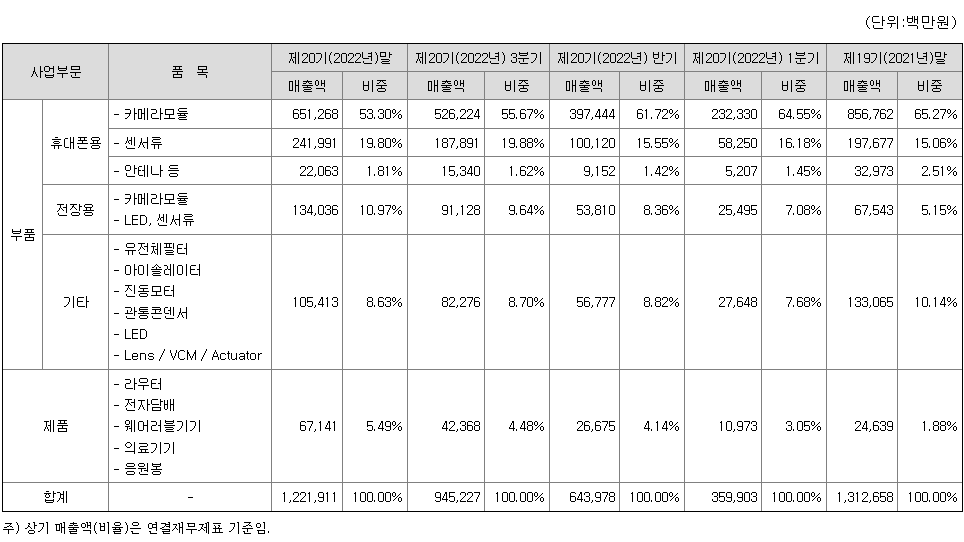 또한, 지난 몇 년간 미래 성장 동력을 확보하기 위해 자동차용 부품(카메라 모듈, 스마트 헤드라이트용 LED, 지문센서, TMS, ECU), 5G용 무선 기기(라우터), 각종 센서 모듈(심박, 온도, 지문인식, 홍채인식, TOF모듈 등) 사업의 다양화 및 고도화, 전자제품(스마트 워치, 무선 헤드셋, 체온계, 전자담배, 보청기 등) 등 신사업을 준비해왔습니다. 센서 모듈 사업은 2018년부터 의미있는 매출이 나오기 시작하였으며, 자동차용 부품과 5G용 무선 부품, 전자제품 사업은 2023년부터 추가적인 성장동력이 될 것으로 예상합니다.