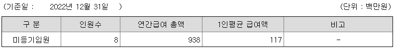 미등기임원의 평균연봉은 1억 1700만원이고 직원수는 8명입니다.