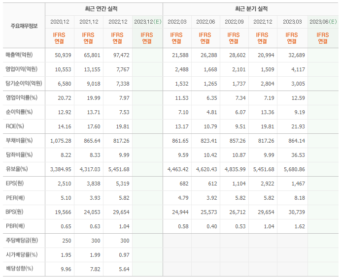 2022년 매출은 9조 7472억, 영업이익은 7767억, 당기순이익은 7338억입니다. 그리고 영업이익률은 7.97%입니다.