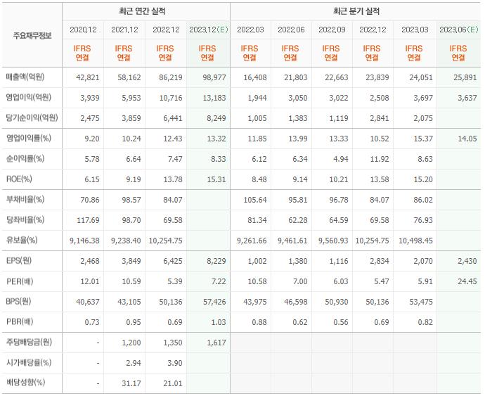 2022년 실적은 8조 6219억, 영업이익은 1조 716억입니다. 그리고 영업이익률은 12.43%입니다.