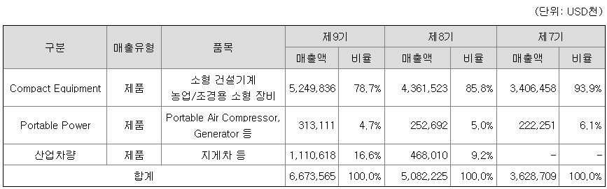 당사는 2022년 누적 기준으로 Compact Equipment 제품 판매를 통해 5,249,836천USD의 매출액을(매출 비중 78.7%), Portable Power 제품 판매를 통해 313,111천USD의 매출액을(매출 비중 4.7%), 산업차량 제품 판매를 통해 1,110,618천USD의 매출액을(매출 비중 16.6%) 달성했습니다. 당사가 판매하는 제품 가격은 원자재 가격, 인건비, 임대료 등에 따라 변동되며, 상세 내용은 아래 2. 주요 제품 및 서비스, 4. 매출 및 수주상황 항목을 참고하여 주시기 바랍니다.
