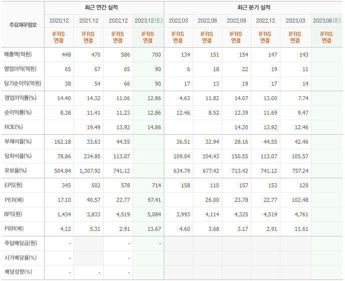 2022년 매출은 586억, 영업이익은 65억, 당기순이익은 66억입니다. 그리고 영업이익률은 11.06%입니다.