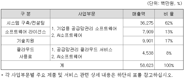 주요 사업 영역은 ▲기업용 공급망관리 소프트웨어, ▲AI 소프트웨어, ▲공급망관리 클라우드 서비스로 구분됩니다. 효율적인 구매 업무에 필수적인 구매시스템 구축부터 협력사와의 동반 성장 및 협업을 위한 협력사 통합 평가·관리 솔루션, AI기술을 활용해 구매 업무의 효율성을 높이고 공급망 위기 대응력을 강화하는 다양한 분석 및예측 솔루션 등을 개발해 기업들에게 공급하고 있습니다.
