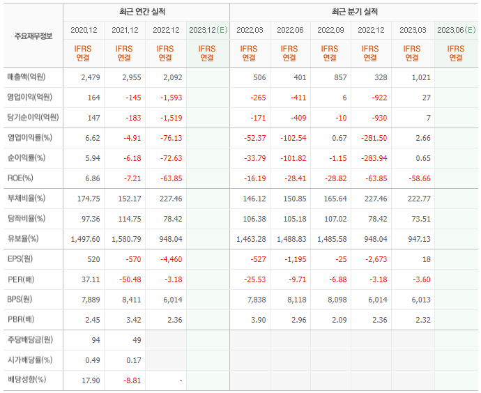 2022년 매출은 2092억, 영업이익은 -1593억, 당기순이익은 -1519억입니다. 그리고 영업이익률은 -76.13%입니다.
