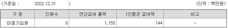 미등기임원의 평균연봉은 1억 4400만원이고 직원수는 8명입니다.