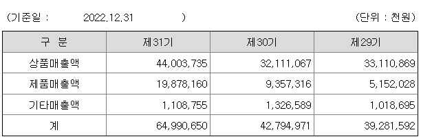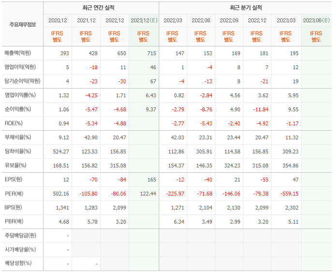 2022년 매출은 650억, 영업이익은 11억, 당기순이익은 -30억입니다. 그리고 영업이익률은 1.71%입니다.