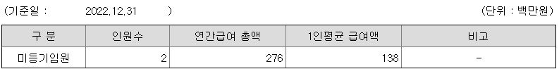 미등기임원의 평균연봉은 1억 3800만원이고 직원수는 2명입니다.