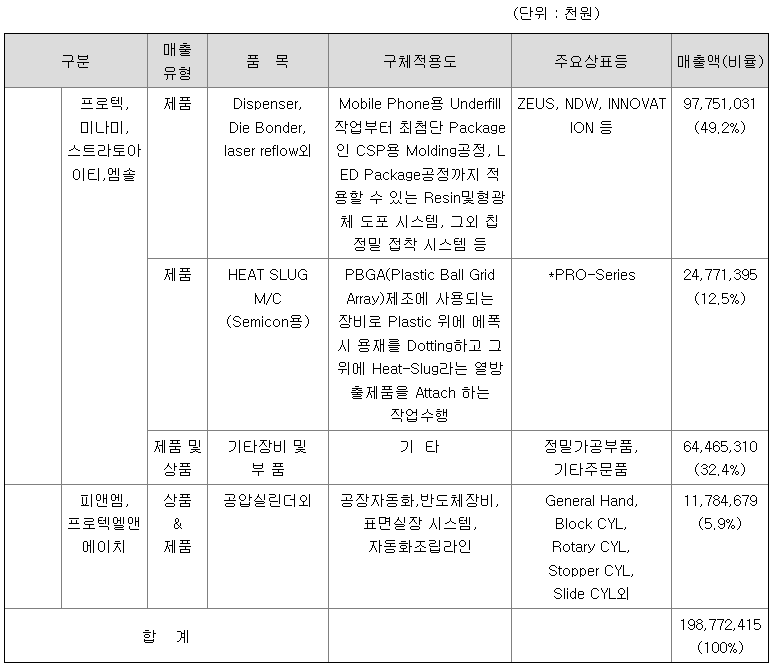 당사는 반도체장비 Dispenser M/C를 1998년 6월에 국내에선 처음으로 국산화 시켰으며, 기술력을 인정받아 국내의 삼성전자, LG전자, 하이닉스반도체, ASE코리아, 스태츠칩팩코리아, 암코테크놀러지코리아 등에 제품을 공급하고 있으며, 아시아권 국가들에 일부 수출을 하고 있습니다.