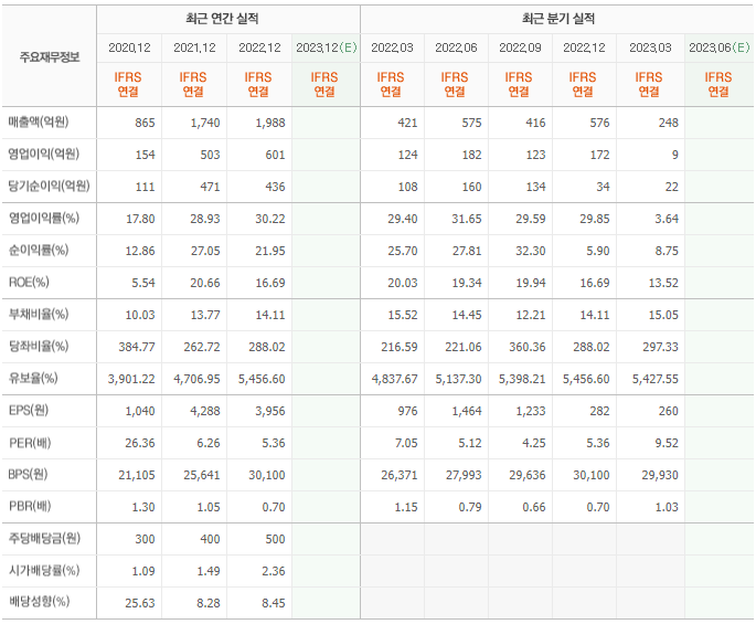 2022년 매출은 1988억, 영업이익은 601억, 당기순이익은 436억입니다. 그리고 영업이익률은 30.22%입니다.