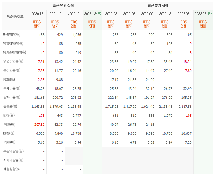 2022년 매출은 1086억, 영업이익은 265억, 당기순이익은 219억입니다. 그리고 영업이익률은 24.42%입니다.
