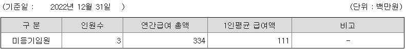 미등기임원의 평균연봉은 1억 1100만원이고 직원수는 3명입니다.
