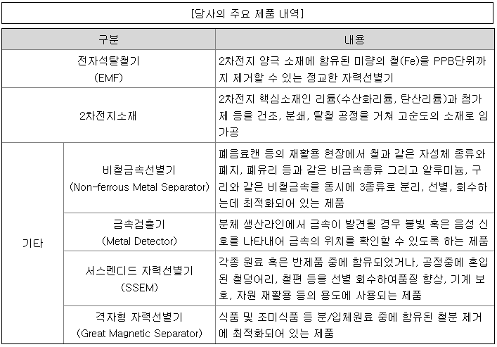 당사가 제조하는 주력 제품은 전자석탈철기(Electro Magnetic Filter, 이하 "EMF") 및 자력선별기(Magnetic Separator, 이하 "MS") 등으로서, 특히 당사의 EMF는 리튬 2차전지의 발화 원인으로 지목되고 있는 양극재 소재에 함유된 미량의 철을 제거하는데 매우 탁월합니다.