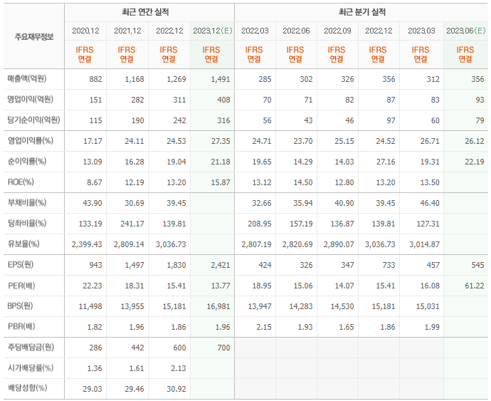 2022년 매출은 1269억, 영업이익은 311억, 당기순이익은 242억입니다. 그리고 영업이익률은 24.53%입니다.