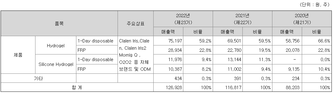 당사는 콘택트렌즈의 제조 및 판매 전문기업입니다. 국내는 자체 브랜드 클라렌(Clalen) 시리즈 판매를 주력으로, 해외는 OEM/ODM 판매 사업을 주력으로 영위하고 있습니다.