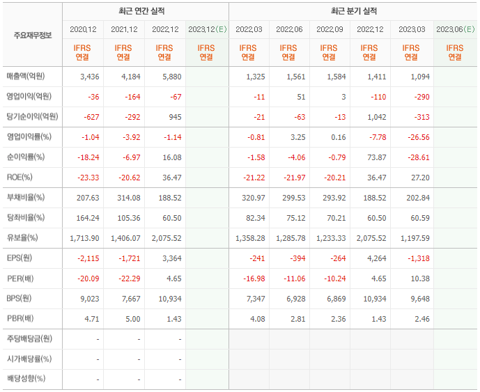 2022년 매출은 5880억, 영업이익은 -67억, 당기순이익은 945억입니다. 그리고 영업이익률은 -1.14%입니다.