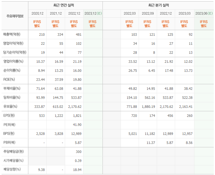 2022년 매출은 481억, 영업이익은 102억, 당기순이익은 77억입니다. 그리고 영업이익률은 21.19%입니다.