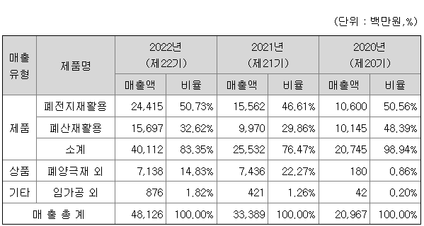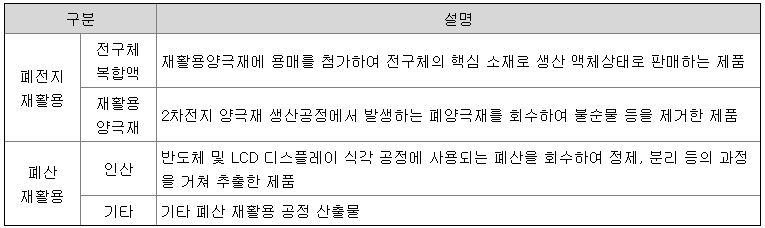 당사는 폐수처리 약품 사업을 시작으로 반도체 및 디스플레이 생산 공정에서 발생하는 폐산을 재활용하여 비료 원료가 되는 인산 등을 생산하는 사업을 영위하며 성장하였으며, 현재는 폐리튬이온 이차전지에서 양극활물질을 정제ㆍ분리하여 전기차에 적용되는 리튬이차전지의 부원료로 공급하는 사업을 영위하고 있습니다.