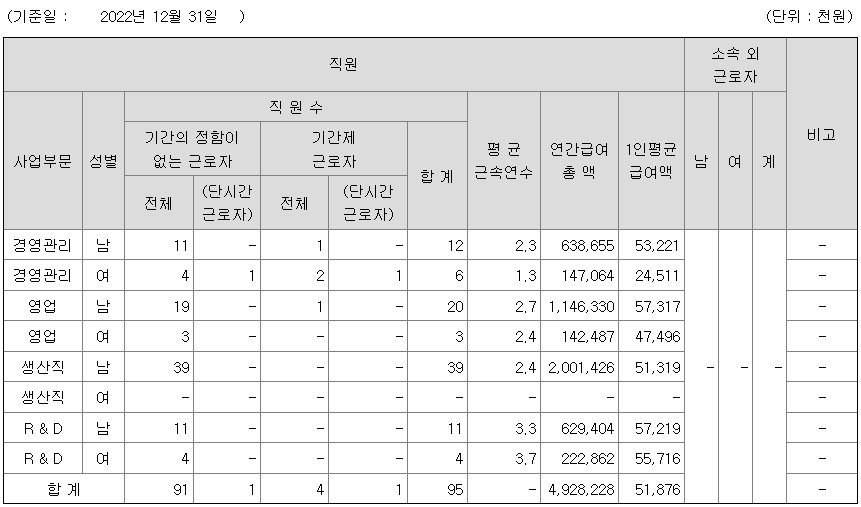 | 사업부문 | 성별 | 직원수 | 평균근속연수 | 평균연봉(백만) |