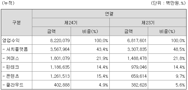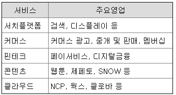 네이버는 국내 1위 인터넷 검색 포털 '네이버(NAVER)'를 기반으로 광고, 커머스 사업을 통해 매출을 창출하고 있습니다. 아울러 금융 씬파일러(Thin Filer)들을 위한 핀테크, 웹툰, 제페토 등의 콘텐츠서비스, 기업용 솔루션을 제공하는 클라우드 등 다각화된 사업 포트폴리오를 기반으로 안정적인 성장을 이어가고 있습니다. 네이버는 기존 사업에서 탄탄한 성장세를 유지하는 한편, 신성장동력인 커머스, 핀테크, 콘텐츠, 클라우드 사업 모두에서 고르고 가파른 성장을 이어가고 있습니다.