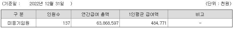미등기임원의 평균연봉은 4억 8400만원이고 직원수는 137명입니다.