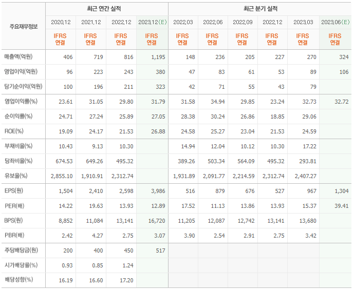 2022년 매출은 816억, 영업이익은 243억, 당기순이익은 211억입니다. 그리고 영업이익률은 29.80%입니다.
