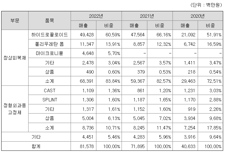 현재는 창상피복재를 주력사업으로 하고 있으며, 창상피복재의 기술을 활용하여 "지혈제", "마이크로니들"도 제조, 판매하고 있습니다.
