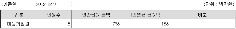 미등기임원의 평균연봉은 1억 5800만원이고 직원수는 5명입니다.