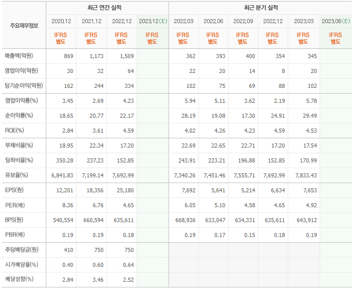 2022년 매출은 1509억, 영업이익은 64억, 당기순이익은 334억입니다. 그리고 영업이익률은 4.23%입니다.