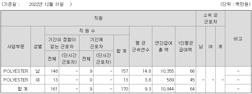 | 사업부문 | 성별 | 직원수 | 평균근속연수 | 평균연봉(백만) |