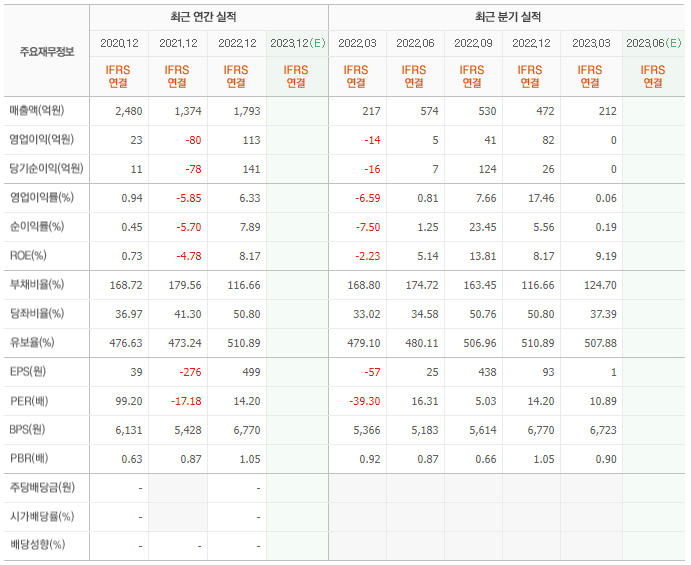 2022년 매출은 1793억, 영업이익은 113억, 당기순이익은 141억입니다. 그리고 영업이익률은 6.33%입니다.
