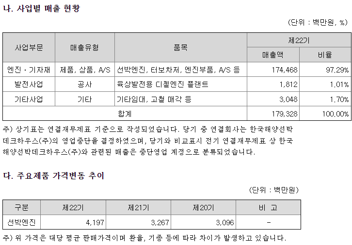 조선업의 수주 상황은 2020년 하반기 이후 글로벌 경기 및 조선업이 회복세를 보이고 선박 부족현상이 나타나 2021년을 기점으로 선박 및 선박엔진 수주가 본격적으로 증가 하였고, 당사의 수주 실적도 눈에 띄게 개선 되었습니다. 연도별로 점차 강화되는 환경 규제 및 노후 선박의 증가로 향후 수주는 당분간 현재 수준에서 크게 벗어 나지 않고 유지될 것으로 예상되며, 증가된 수주량에 따른 손익개선 효과가 차츰 나타날 것으로 예상됩니다. 또한 환경규제에 따른 친환경 선박엔진 시장의 성장에 따라 당사 및 자회사의 발전에 좋은 기회가 될 것으로 기대됩니다.
