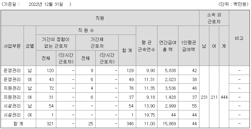 | 사업부문 | 성별 | 직원수 | 평균근속연수 | 평균연봉(백만) |