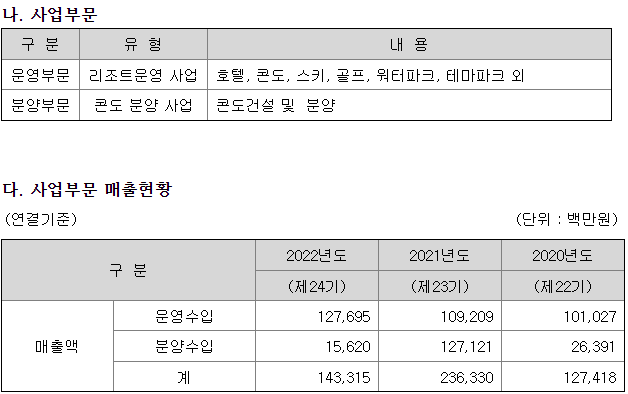 당사는 프리미엄 리조트 운영 및 개발 전문 기업입니다. 스키장, 골프장, 워터파크 등 다양한 레저시설을 통해 종합 관광 휴양지를 운영하고있습니다. 또한, 프리미엄콘도 디벨로퍼로서 콘도 및 회원권 분양사업을 영위하고 있습니다.